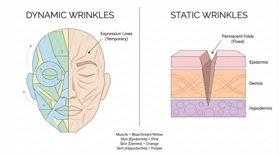 細かいシワ(ファインライン)は、目元や口元、額などに現れる浅い線状の凹みのことを指します。 海外のクリニックの解説では、シワは大きく「動的なシワ」と「静的なシワ」に分けて説明されることがあります。