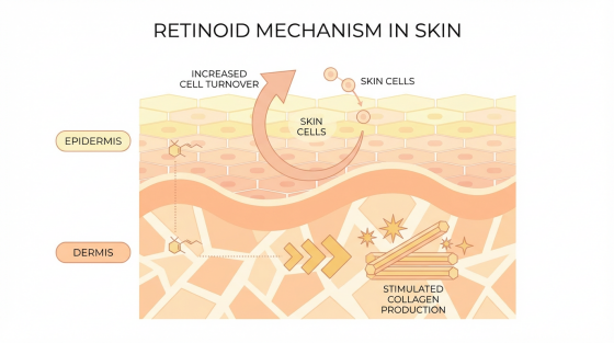 レチノイドは、ビタミンA由来の成分で、細かいシワケアの柱として多くの皮膚科医が挙げる成分です。Dermatology of Seattle & Bellevue や GoodRx、Mayo Clinic などの解説によると、レチノイドは次のような働きを持つと説明されています。