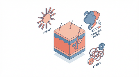 外側からのダメージも大きな要因です。 紫外線、とくに肌の深いところまで届く UVA は、コラーゲンやエラスチンを壊し、いわゆる「光老化」を進める主犯格とされています。GoodRx や Mayo Clinic など複数の医療サイトが、日々の紫外線対策こそもっともコストパフォーマンスの良いエイジングケアだと強調しています。